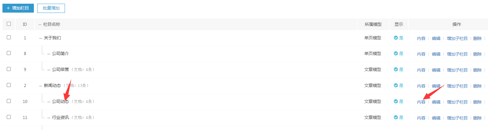進入后臺 —> 欄目管理—>點擊進對應的欄目/內容 進行內容管理,如下圖