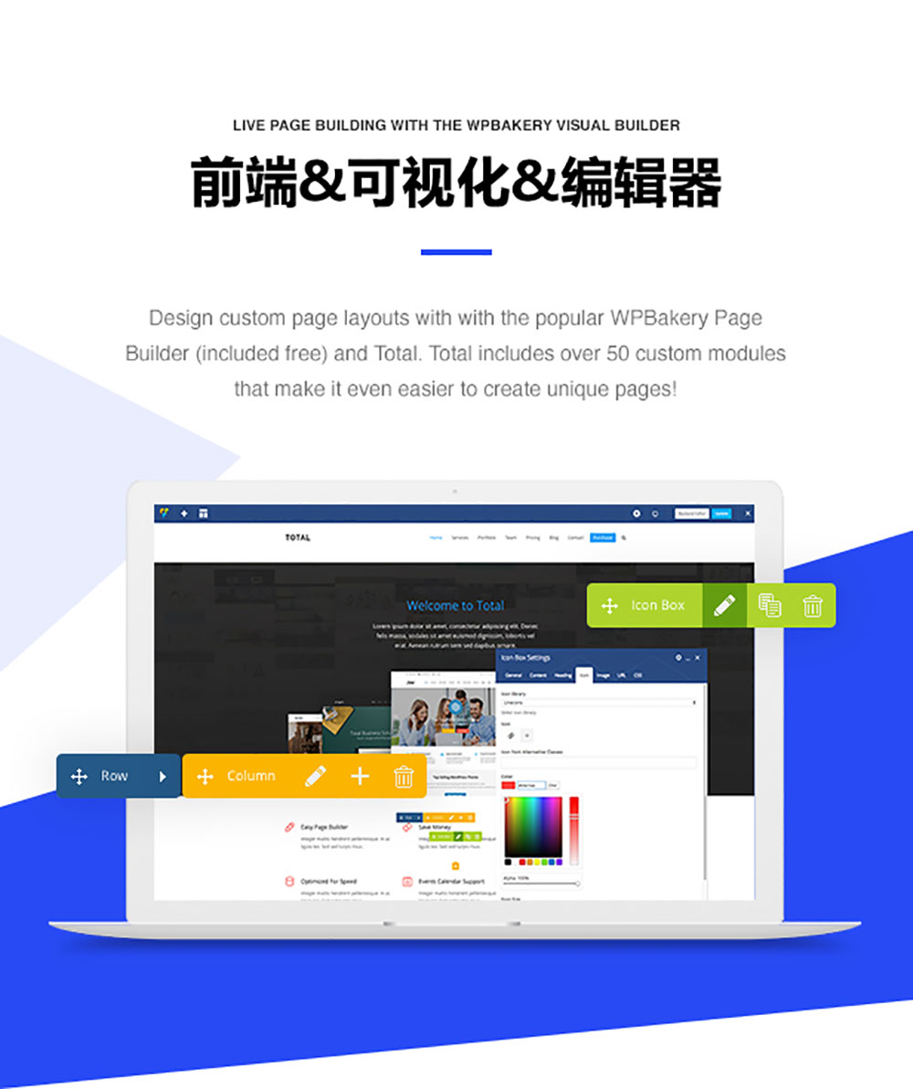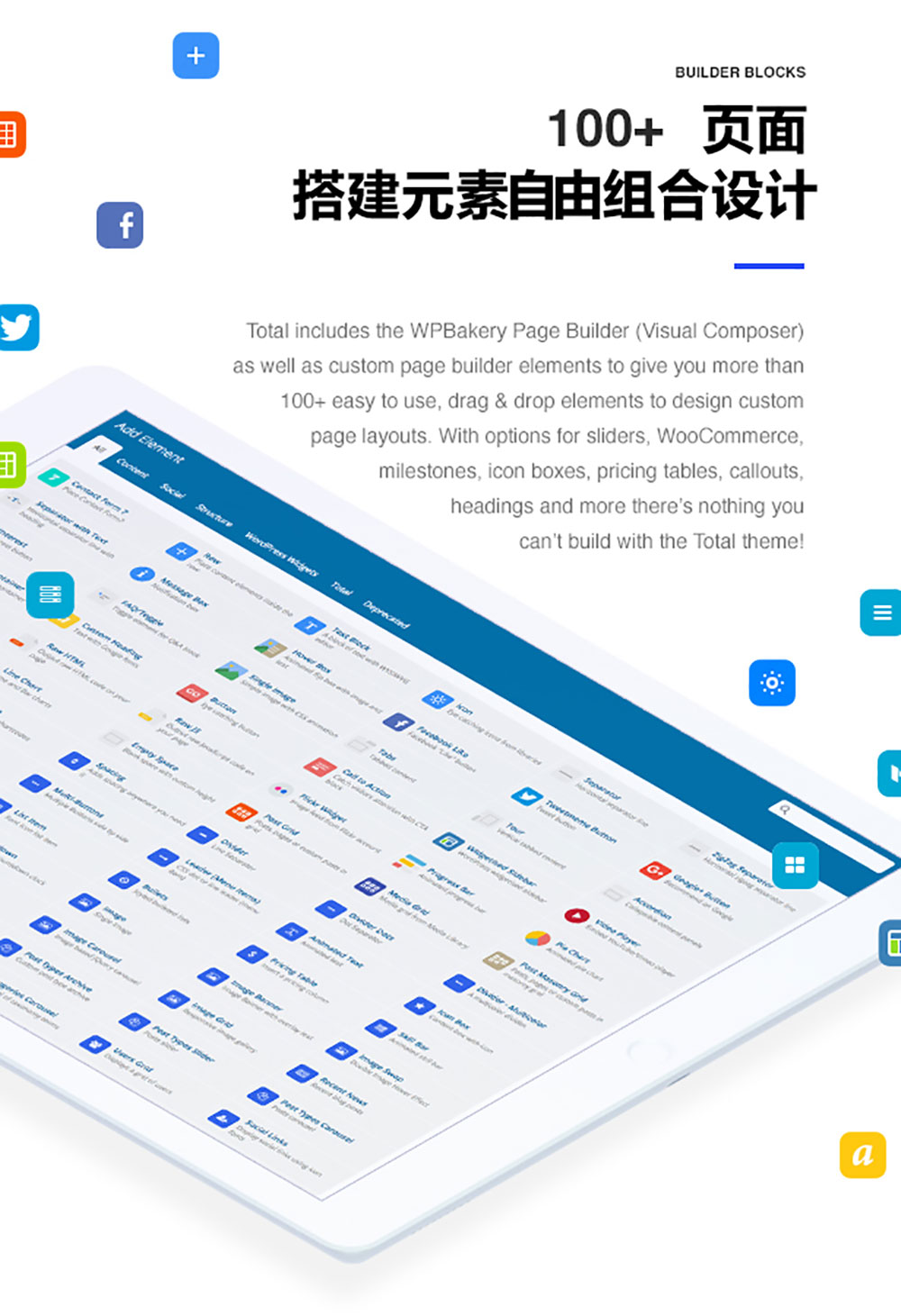 無限的自定義頁面:Total使用附帶的WPBakery Page Builder頁面構建器,可以立即為每個頁面創建獨特的布局,并為您的客戶和/或訪問者提供驚喜。獨有的可視化編輯器模塊:Total 主題包含超過100+獨特的WPBakery Page Builder頁面編制器模塊,可自由組合應用,創造無限可能,使創建您的網站更容易!